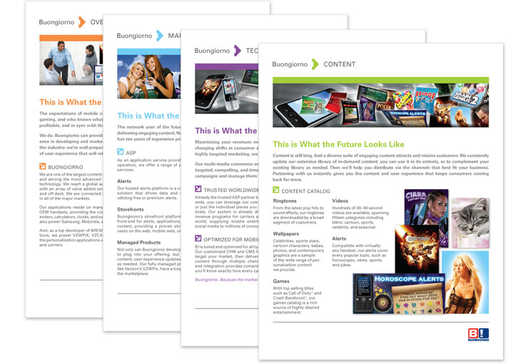 CONTRIBUTION Buongiorno—an Italian mobile media company—was entering the US market and needed branding help from Oya. They wanted sales material to help communicate their services and show they were a leading partner for mobile operations. To stand apart from the competition without going through an entire brand audit and refresh, I created a family of sales sheets that focused on illustration style rather than strong branded elements. Each graphic banner supported the content and would be able to adopt future brand adjustments. A folder with a simple parent logo was also prepared in order to last through any future brand updates.